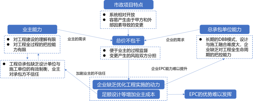 簡(jiǎn)言之,市政項(xiàng)目的特點(diǎn)、業(yè)主和總承包單位的能力導(dǎo)致了市政工程項(xiàng)目是總價(jià)不包干的,而這使得總承包單位缺乏優(yōu)化設(shè)計(jì)施工融合的動(dòng)力,甚至使得總承包單位進(jìn)行設(shè)計(jì)與施工的畸形融合。而這一方面使得業(yè)主對(duì)推行工程總承包興趣缺失甚至存在抵觸,對(duì)總承包單位的管理能力建設(shè)遲緩,另一方面也使得總承包單位的工程總承包能力建設(shè)推進(jìn)緩慢,而這又進(jìn)一步固化了總價(jià)不包干的模式,從而使得工程總承包的優(yōu)勢(shì)難以發(fā)揮,由此,工程總承包推進(jìn)艱難。
