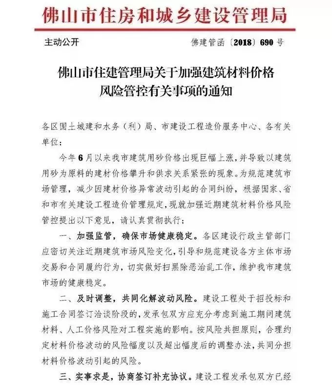 在本通知發布之前已開工或已簽訂施工合同的建設工程項目,已簽封閉合同的,按合同執行;如施工合同中對砂石、水泥、預拌砂漿、混凝土及混凝土制品等材料調差未進行約定或者約定不明的,發承包雙方可按照平等自愿、公平合理的原則重新協商簽訂補充協議,對2018年7月以后(含7月)實施的工程量中的材料價差予以調整。