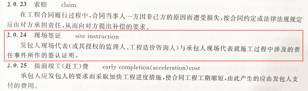 依據(jù)《建設(shè)工程工程量清單計價規(guī)范》(GB50500-2013)第2.0.24條對現(xiàn)場簽證的定義:“發(fā)包人現(xiàn)場代表與承包人現(xiàn)場代表就施工過程中涉及的責任事件所作的簽認證明。”
