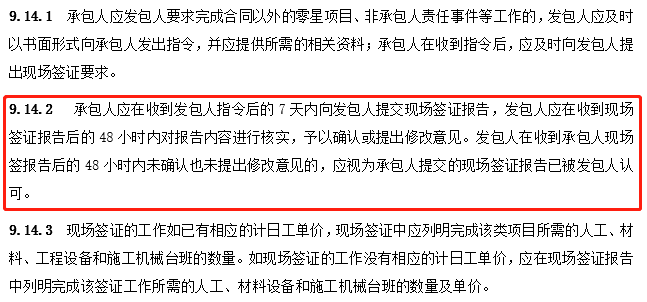 此外,第9.14.2條中,“......發(fā)包人在收到承包人現(xiàn)場簽報告后的48小時內(nèi)未確認也未提出修改意見的,應(yīng)視為承包人提交的現(xiàn)場簽證報告已被發(fā)包人認可。”即,從時限來講,“48小時”亦非能夠滿足發(fā)包方充分詢價并與承包方定價的時長。
