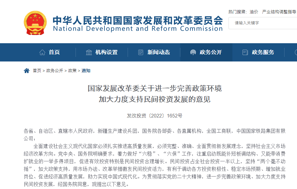 全面建設社會主義現代化國家必須扎實推進高質量發展,必須完整、準確、全面貫徹新發展理念,堅持社會主義市場經濟改革方向。黨中央、國務院明確要求,著力做好“六穩”、“六保”工作,注重啟動既能補短板調結構、又能帶消費擴就業的一舉多得項目,促進有效投資特別是民間投資合理增長。民間投資占全社會投資一半以上,堅持“兩個毫不動搖”,加大政策支持,用市場辦法、改革舉措激發民間投資活力,有利于調動各方投資積極性、穩定市場預期、增加就業崗位、促進經濟高質量發展,助力實現中國式現代化。為貫徹落實黨的二十大精神,進一步完善政策環境、加大力度支持民間投資發展,經國務院同意,現提出以下意見。