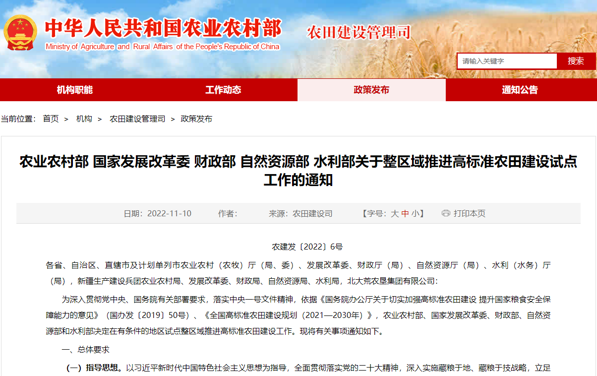 農業農村部 國家發展改革委 財政部 自然資源部 水利部:《關于整區域推進高標準農田建設試點工作的通知》