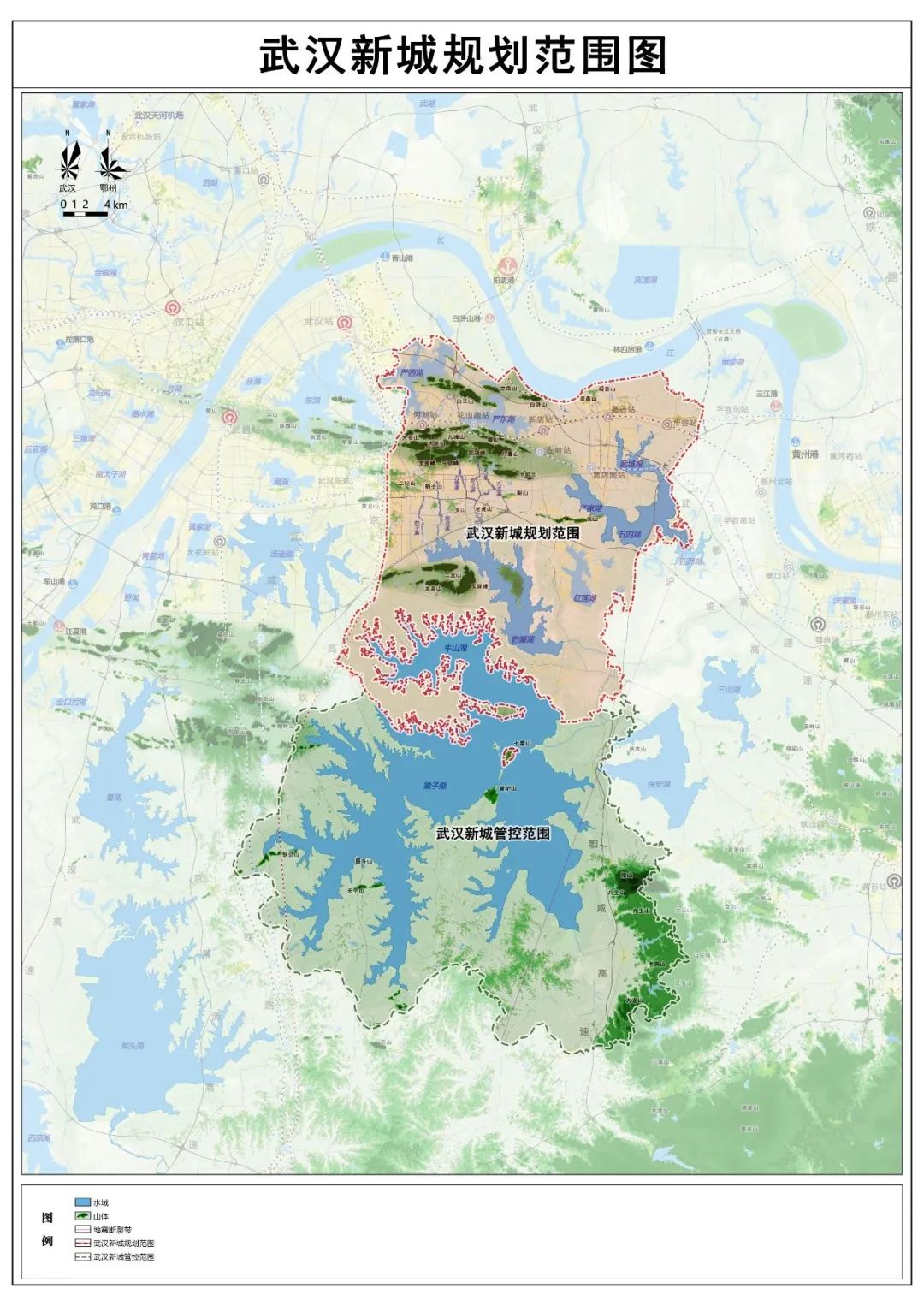 武漢新城規劃范圍東至鄂咸高速,南至梁子湖,西至京廣鐵路,北至長江南岸,規劃面積約719平方公里;武漢新城管控范圍拓展至環梁子湖區域,規劃面積約1689平方公里。