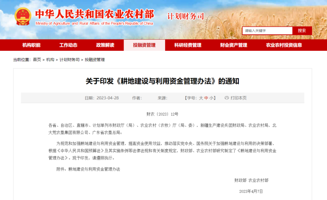 耕地建設與利用資金由財政部會同農業農村部管理。