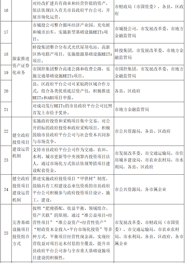 6.探索推進(jìn)資產(chǎn)證券化業(yè)務(wù)。市城投公司整合循環(huán)經(jīng)濟(jì)產(chǎn)業(yè)園、充電樁和城市泊車,實(shí)施新型基礎(chǔ)設(shè)施REITs項(xiàng)目;蚌投集團(tuán)整合分布式光伏屋頂電站、高新區(qū)熱電聯(lián)產(chǎn)項(xiàng)目,實(shí)施能源基礎(chǔ)設(shè)施REITs項(xiàng)目;市國控集團(tuán)整合高速公路和收費(fèi)公路,實(shí)施交通基礎(chǔ)設(shè)施REITs項(xiàng)目??h、區(qū)政府平臺(tái)公司可采取跨區(qū)域合作方式,組合各類優(yōu)質(zhì)底層資產(chǎn)包,積極推進(jìn)REITs和ABS項(xiàng)目申報(bào)。2025年底前,市屬企業(yè)力爭發(fā)行REITs不低于2支,募集資金規(guī)模不低于50億元。對成功發(fā)行REITs的市縣政府平臺(tái)公司比照首發(fā)上市給予獎(jiǎng)補(bǔ)。(責(zé)任單位:市發(fā)展改革委、市地方金融監(jiān)管局、各縣、區(qū)政府,各市屬企業(yè))