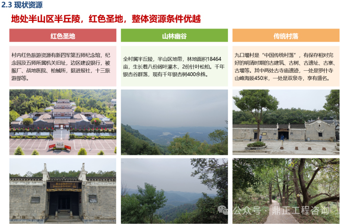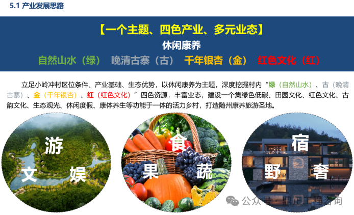 其中,雙河村通過發揮特色農業產業優勢建設農業品牌,延伸農業加工產業鏈開啟創收新征程,積極發展鄉村休閑業打造詩意田園水鄉,主要打造田園綜合體、濱河休閑體驗,拓展農業休閑旅游業態。泉水寺村重點結合國家級專用汽車和應急裝備檢測研發基地的建設基礎,構建以產業基地配套服務為主導,以生態種養、休閑農業為特色的產業體系。小嶺沖村重點整合“綠(自然山水)、古(晚清古寨)、金(千年銀杏)、紅(紅色文化)”四色資源,構建“綠+古+金+紅”四色產業,打造品質活力鄉村旅游。九口堰村重點以豐富的紅色文化、自然資源為基礎,以紅色文化體驗為主導產業,以文化帶動旅游,拓展紅色體驗、康養度假等產業,打造全國紅色教育示范基地。
