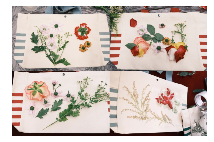 大家挑選出自己喜歡的植物后,在潔白的帆布包上精心構思布局,將植物設計成自己喜歡的圖案,用透明膠固定,然后用橡膠錘耐心敲打,直至看清植物脈絡紋理,均勻撕開膠帶,自己設計的圖案通過拓染就印在了帆布包上。