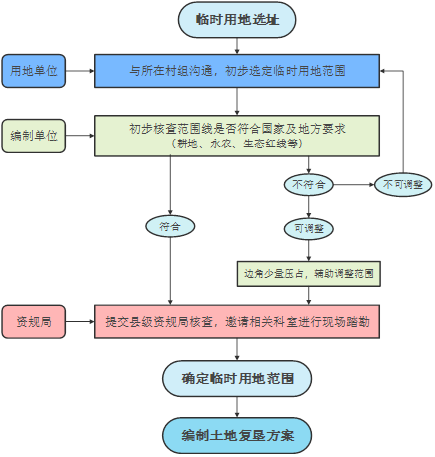 需先確定臨時(shí)用地位置及范圍,經(jīng)自然資源主管部門核查確認(rèn)后,再開展土地復(fù)墾方案編制、臨時(shí)用地報(bào)批等后續(xù)工作,以防止項(xiàng)目開展后出現(xiàn)自然資源主管部門單位審批不通過或不了解項(xiàng)目情況、臨時(shí)用地范圍不可行等情況,導(dǎo)致項(xiàng)目停滯及反復(fù)溝通等問題。