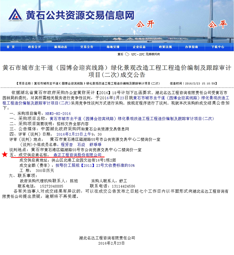 【經(jīng)營(yíng)成果】我司中標(biāo)黃石市城市主干道(園博會(huì)迎賓線路)綠化景觀改造工程工程造價(jià)編制及跟蹤審計(jì)項(xiàng)目(二次)