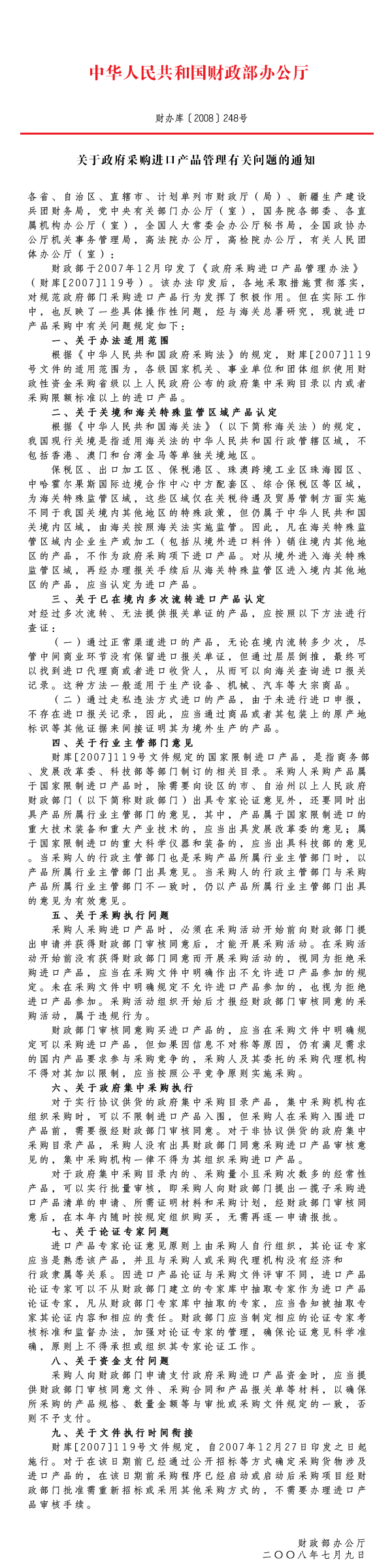 關于政府采購進口產品管理有關問題的通知(財辦庫〔2008〕248號)